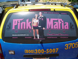 trunk signs, large bumper stickers, inside taxi’s